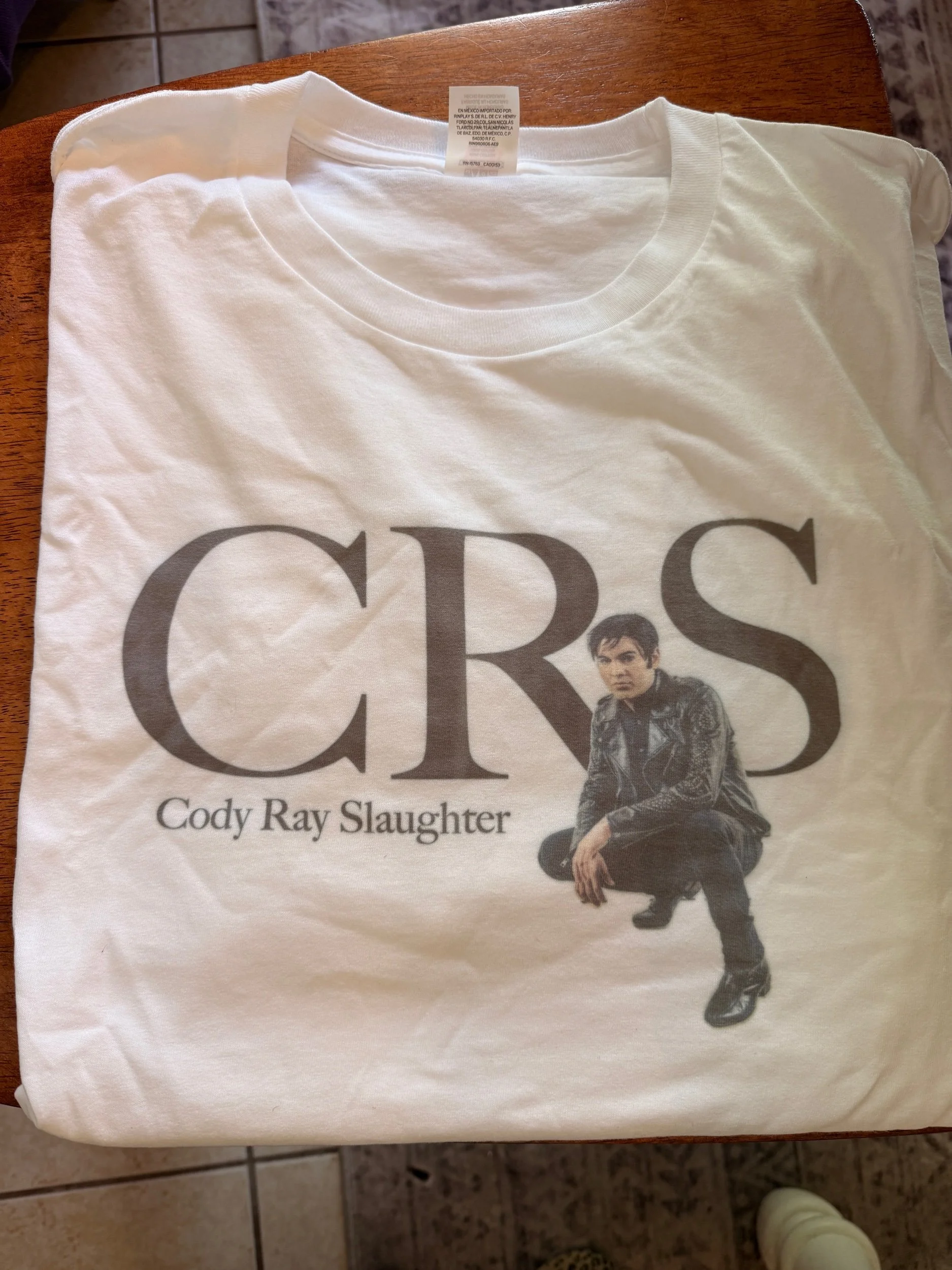 Image 1 of 1 CRS Cody Ray Slaughter t-shirt $10.00 CRS Cody Ray Slaughter t-shirt Size: XL XXL Get notified by email when this item is back in stock Add To Cart Added! CRS Cody Ray Slaughter t-shirt